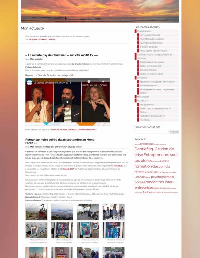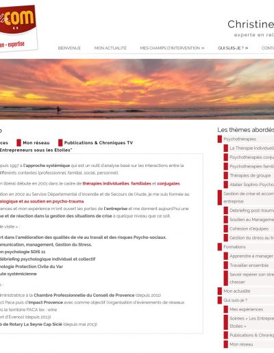 Un site solaire, dynamique, qui permet de présenter ses champs de compétences, de la thérapie en cabinet à des missions ou formations en situation de Crise.