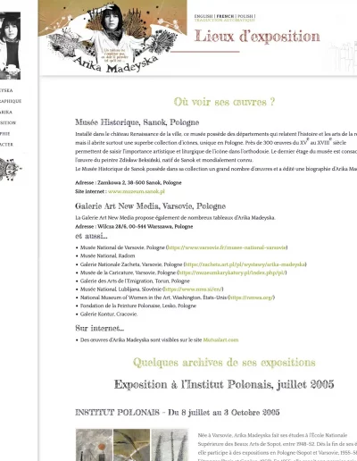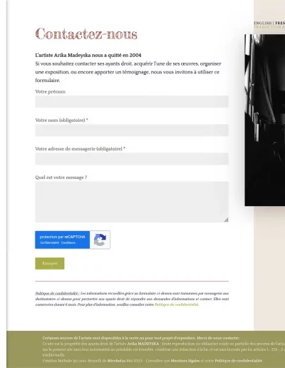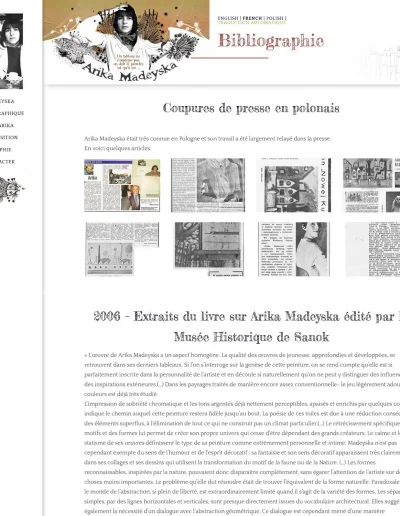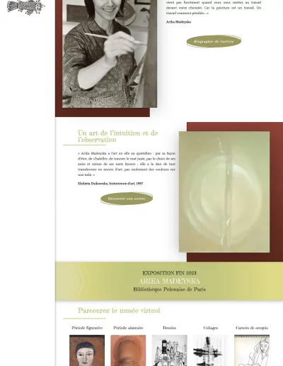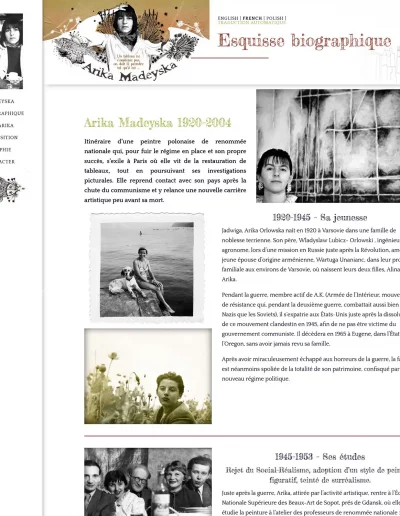 Il y a quelques années, Madame Honorata Jonquière et sa fille Séverine m’ont confiée la réalisation du site internet destiné à présenter l’œuvre de leur époux et père Emmanuel Jonquière. Cette année, à l’occasion d’une rétrospective programmée en novembre 2023 à Paris, c’est avec beaucoup de gratitude qu’elles m’ont renouvelé leur confiance pour la création du site internet de la mère d’Honorata Jonquière. Arika Madeyska est une grande artiste polonaise, reconnue et exposée en Pologne et dans les galeries parisiennes spécialisées dans l’art moderne et contemporain polonais.