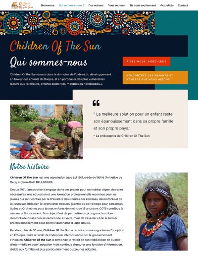 Il s’agit du site internet de l’association sarthoise Children Of The Sun qui aide les orphelins d’Éthiopie depuis 1991 et qui est parrainée par quelques célébrités comme Emmanuelle Béart, Hélène Rollès ou encore Frédéric Zeitoun.