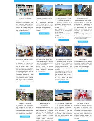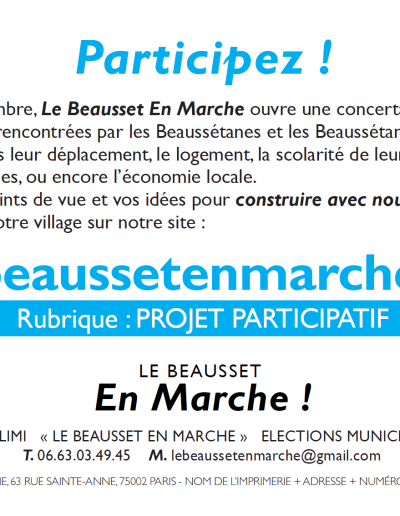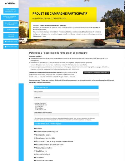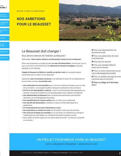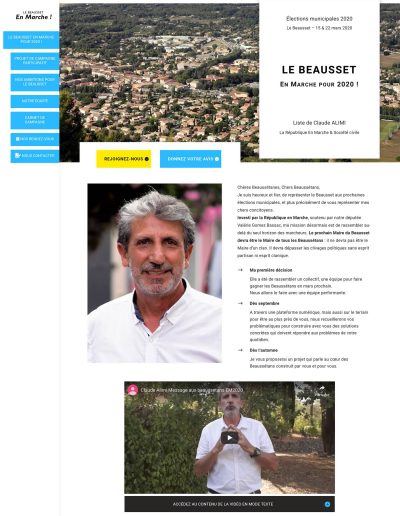 Le site internet de la liste « Le Beausset en Marche », conduite par le Dr Claude Alimi pour les élections municipales du Beausset, a été ouvert au public le 25 septembre et fermera au lendemain du 2ème tour. Développé sous WordPress, il comporte une consultation en ligne au moyen d’un questionnaire sur les enjeux du village et les désirs de ses habitants.